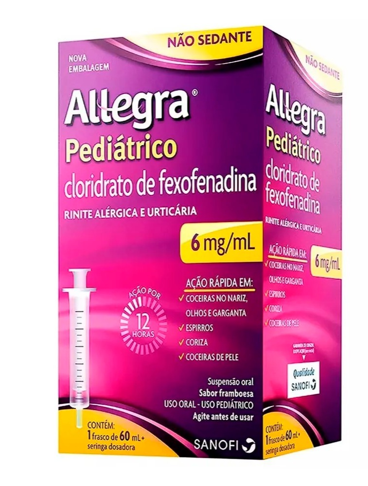 Allegra® Pediátrico (cloridrato de fexofenadina) é um xarope antialérgico que alivia rapidamente os sintomas da alergia* em crianças. Com ação segura e eficaz na rinite alérgica e urticária, Allegra® Pediátrico é a marca mais recomendada pelos pediatras¹. Allegra® Pediátrico é um antialérgico infantil que não dá sono² e não prejudica o desempenho escolar³?7, além de possuir ação rápida contra espirros, coriza, nariz entupido e coceiras. Disponível nas versões de 60 e 150ml, ele vem com uma seringa dosadora, tem sabor framboesa e é livre de glúten e lactose. Referências:*Rinite alérgica e urticária.1. Fonte: IQVIA GPS, Total Brasil, MAT Ago’22 2. Bula do produto. Estudos não demonstraram associação do uso do produto com alteração no padrão do sono. 3. Mansfield, LE. Fexofenadine in pediatrics: oral tablets and suspension formulations. Expert Opin. Pharmacother. 2008; 9(2):329-337. 3 -Graft DF et al. Safety of fexofenadine in children treated for seasonal allergic rhinitis. Ann Allergy Asthma Immunol 2001 ; 87 : 22 -6 4. Blaiss MS; Allergic Rhinitis in Schoolchildren Consensus Group. Allergic rhinitis and impairment issues in schoolchildren: a consensus report. Curr Med Res Opin. 2004;20(12):1937-1952. doi:10.1185/030079904x13266. 5. Tanner LA, et al. Effect of fexofenadine HCL on quality of life and work, classroom, and daily activity impairment in patients with seasonal allergic rhinitis. Am J Managed Care 1999;5(Suppl.):S235-47. 6. Baharudin A et al. Using patient profiles to guide the choice of antihistamines in the primary care setting in Malaysia: expert consensus and recommendations. Ther Clin Risk Manag. 2019;15:1267-75. 7. Hindmarch I et al. A double-blind, placebo-controlled investigation of the effects of fexofenadine, loratadine and promethazine on cognitive and psychomotor function. Br J Clin Pharmacol. 1999;48:200-206. ALLEGRA® (cloridrato de fexofenadina). Indicações: é um anti-histamínico destinado ao tratamento das manifestações alérgicas, tais como sintomas de rinite alérgica (incluindo espirros, obstrução nasal, prurido, coriza, conjuntivite alérgica) e urticária (erupção avermelhada e pruriginosa na pele). MS 1.8326.0359. O USO DO MEDICAMENTO PODE TRAZER ALGUNS RISCOS. Leia atentamente a bula. SE PERSISTIREM OS SINTOMAS, O MÉDICO DEVERÁ SER CONSULTADO. Nov/2022. MAT-BR-2205862