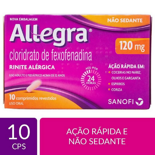 Allegra® (cloridrato de fexofenadina) é um antialérgico que não dá sono¹, indicado para o tratamento dos sintomas da rinite alérgica e urticária, como espirros, nariz entupido, coriza e coceiras. Allegra® é o antialérgico nº1 do mercado², tem ação rápida e prolongada no alívio da alergia*: age por 24 horas¹ e não dá sono¹, para você viver o dia inteiro no seu melhor! Allegra® 120 mg é um remédio para alergia com 10 comprimidos revestidos*, indicado para uso adulto e pediátrico a partir dos 12 anos. Referências:*Rinite alérgica e urticária.1. Bula do produto. Estudos não demonstraram associação do uso do produto com alteração no padrão do sono.2. IQVIA: FMB Market Share Valor; T.Brazil; Adults market; MAT May’22ALLEGRA®? (cloridrato de fexofenadina). Indicações: é um anti-histamínico destinado ao tratamento das manifestações alérgicas, tais como sintomas de rinite alérgica (incluindo espirros, obstrução nasal, prurido, coriza e conjuntivite alérgica) e urticária (erupção avermelhada e pruriginosa na pele). MS 1.8326.0359. O USO DO MEDICAMENTO PODE TRAZER ALGUNS RISCOS. Leia atentamente a bula. SE PERSISTIREM OS SINTOMAS, O MÉDICO DEVERÁ SER CONSULTADO. Nov/22.MAT-BR-2205862.